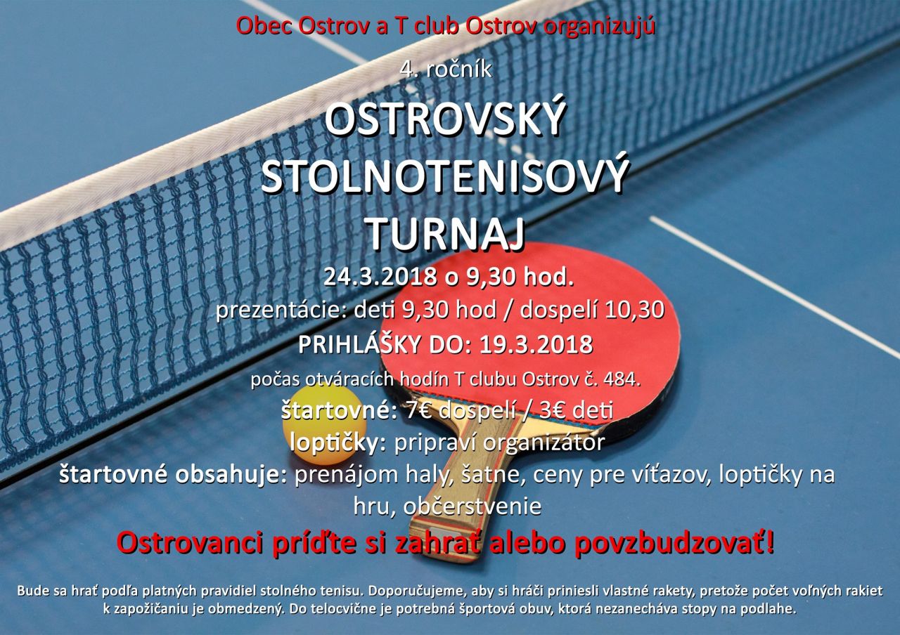 T-club a obec Ostrov organizujú 4.ročník Ostrovského Stolnotenisového Turnaja. 24.3.2018 od 9:30 sa tešíme na hráčov a fanúšikov aby sme mohli spolu prežiť príjemnú sobotu plnú určite aj komických situácií... Podmienky nie sú zložité : Trvalé bydlisko v Ostrove, dobrá nálada a chuť sa zabaviť...